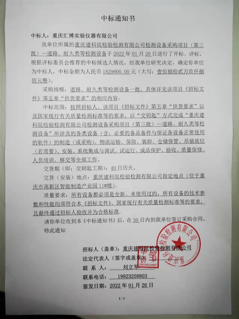 重慶建科院檢驗(yàn)檢測有限公司委托中招國際招標(biāo)有限公司對我公司檢測設(shè)備采購項(xiàng)目(項(xiàng)目號(hào):TC219D1RL )重慶建科院檢驗(yàn)檢測有限公司檢測設(shè)備采購項(xiàng)目(第三批)—道路、耐久類等檢測設(shè)備進(jìn)行了公開招標(biāo)采購,現(xiàn)已完成全部采購程序。確認(rèn)重慶匯博實(shí)驗(yàn)儀器設(shè)備有限公司為檢測設(shè)備采購項(xiàng)目(第三批)—道路、耐久類等檢測設(shè)備中標(biāo)人,中標(biāo)價(jià)為1829800.00元(大寫:壹佰捌拾貳萬玖仟捌佰元整)。