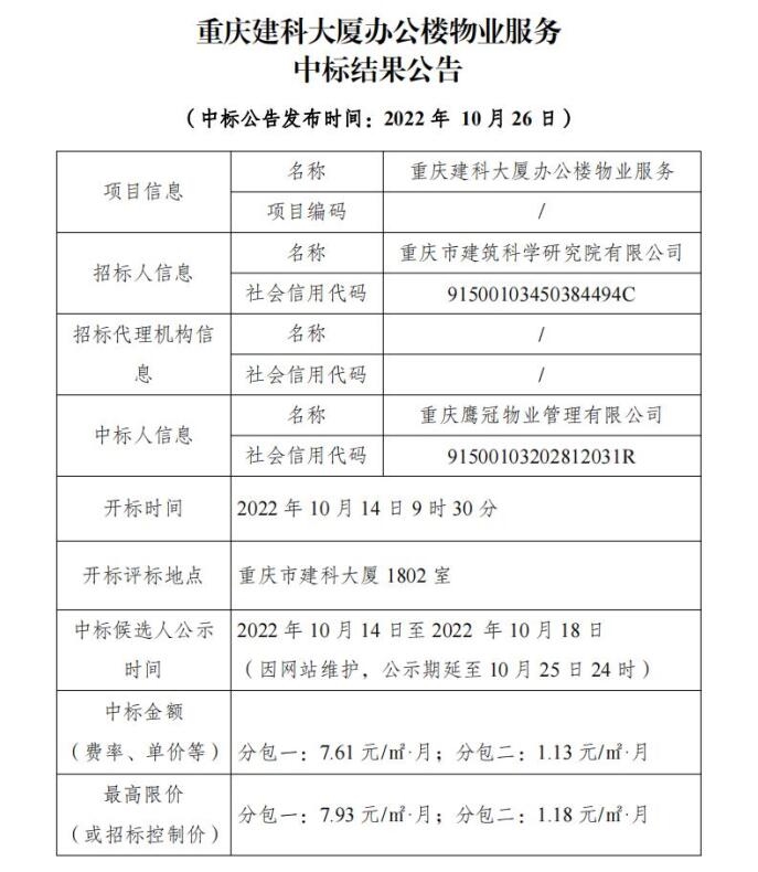 重慶建科大廈辦公樓物業服務中標結果公告如下: