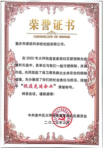 3月23日,大坪街道召開(kāi)“疫”路有你,與愛(ài)同行——暨抗疫“最美黨員”表彰大會(huì),為在2022年大坪街道袁家崗社區(qū)新冠肺炎疫情殲滅戰(zhàn)中表現(xiàn)優(yōu)秀的社會(huì)團(tuán)體與個(gè)人頒發(fā)榮譽(yù)證書,市建科院公司獲“抗疫先進(jìn)企業(yè)”榮譽(yù)稱號(hào)。