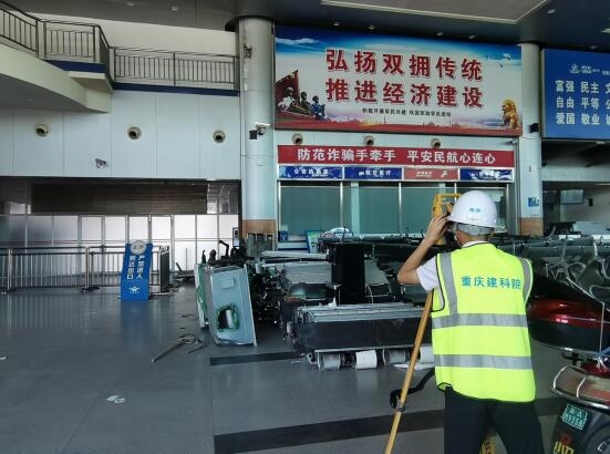 由于時間緊、任務(wù)重,為保證萬州五橋機場T1航站樓改造升級后續(xù)工作順利推進,市建科院公司接到委托后立即組織了在檢測、鑒定領(lǐng)域具有豐富經(jīng)驗的專家及檢測人員進駐現(xiàn)場進行檢測。檢測人員嚴格按照相關(guān)規(guī)范的要求,充分考慮現(xiàn)場檢測的客觀條件,編制了詳盡的檢測方案,于2023年8月29日開始現(xiàn)場檢測。在所有檢測人員的共同努力下,于8月31日如期完成了現(xiàn)場檢測工作,形成的檢測、鑒定報告為后續(xù)改造設(shè)計提供了依據(jù)。