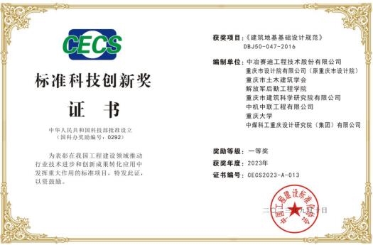 近日,2023年度中國工程建設(shè)標(biāo)準(zhǔn)化學(xué)術(shù)大會暨標(biāo)準(zhǔn)科技創(chuàng)新獎頒獎典禮在廣西南寧舉行,重慶設(shè)計集團市建科院公司黨委委員、副總經(jīng)理、總工程師張京街榮獲“標(biāo)準(zhǔn)科技創(chuàng)新獎領(lǐng)軍人才”稱號,由重慶建科院參編的地方標(biāo)準(zhǔn)獲獎項目《建筑地基基礎(chǔ)設(shè)計規(guī)范》(DBJ50-047-2016)榮獲“標(biāo)準(zhǔn)科技創(chuàng)新一等獎”。
